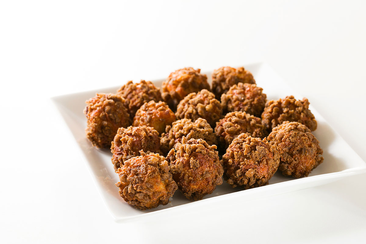 - 同社取締役の楳田慎一さんは、「デンプンの粘りは水分量の影響を受けやすいため、今回の事業でデンプンを扱えるように製造機を改良することで、その影響度のコントロールに挑戦しました」と話します。試行錯誤の末、大豆と玄米で別々に生地をつくり、最後に組み合わせる方法で「玄米ギャンモ」をひとつの形にしました。大豆ミートを豆腐でつなぎボール状に成形した表面を、粉体にした玄米パフで覆ったもので、調理済みの揚げ物として冷凍で出荷され、店舗で解凍して温めて使用します。